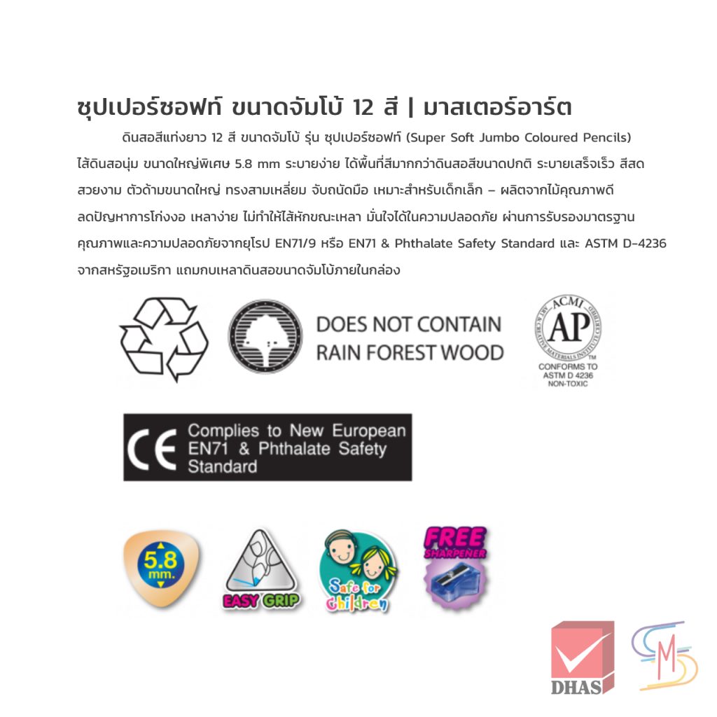 ดินสอสีไม้แท่งยาว รูปทรงสามเหลี่ยม ไส้ใหญ่ ขนาดจัมโบ้ รุ่นซุปเปอร์ซอฟท์เนื้อสีนุ่ม สำหรับเด็กเล็ก ออกแบบเพื่อการฝึกจับดินสอที่ถูกต้อง _x005F_x005F_x005F_x005F_x000D_ – – – – – – – – – – – – – – – – – – – – – – – – – – – -_x005F_x005F_x005F_x005F_x000D_ ดินสอสีแท่งยาว 12 สี ขนาดจัมโบ้ รุ่น ซุปเปอร์ซอฟท์_x005F_x005F_x005F_x005F_x000D_ – ไส้ดินสอสีขนาดใหญ่พิเศษ 5.8 มม._x005F_x005F_x005F_x005F_x000D_ – ระบายง่าย นุ่มลื่น ได้พื้นที่สีมากกว่าดินสอสีขนาดปกติ ระบายเสร็จเร็ว สีสด สวยงาม_x005F_x005F_x005F_x005F_x000D_ – ตัวด้ามทรงสามเหลี่ยมขนาดจัมโบ้ จับถนัดมือ_x005F_x005F_x005F_x005F_x000D_ – ผลิตจากไม้คุณภาพดี ลดปัญหาการโก่งงอ เหลาง่าย ไม่ทำให้ไส้หักขณะเหลา_x005F_x005F_x005F_x005F_x000D_ – สีเนื้อไม้ธรรมชาติ ปลอดภัยกับผู้ใช้_x005F_x005F_x005F_x005F_x000D_ – แถมฟรี กบเหลาดินสอขนาดจัมโบ้ภายในกล่อง_x005F_x005F_x005F_x005F_x000D_ – บรรจุ 12 สี / กล่อง_x005F_x005F_x005F_x005F_x000D_ – จำนวน 1 กล่อง เงื่อนไขการรับประกัน เปลี่ยน/คืนสินค้า (รับเปลี่ยน/คืน ภายใน 15 วัน นับจากวันที่ซื้อ)- สินค้าที่จะทำการเปลี่ยนคืน ต้องมีสภาพสมบูรณ์แบบเดียวกันกับที่บริษัทนำส่งให้- กรณีสินค้าชำรุดเสียหายจากการขนส่ง/หมดอายุ/ชำรุดจากโรงงาน จัดส่งสินค้าเปลี่ยนให้ภายใน 5-7 วัน ✅ โดยบริษัทจะเป็นผู้รับผิดชอบค่าใช้จ่าย- กรณีอื่นนอกเหนือจากที่กล่าวมาข้างต้น ขอสงวนสิทธิ์ให้ลูกค้าเป็นผู้รับผิดชอบค่าจัดส่งที่เกิดขึ้น❗️ สินค้าร่วมโปรโมชั่น Clearance หรือสินค้าที่มีการแจ้งตั้งแต่ต้นว่ามีตำหนิ ไม่รับเปลี่ยนคืนทุกกรณี ❗️สินค้าคละสี คละลาย ลูกค้าไม่สามารถเลือกเองได้นะคะ