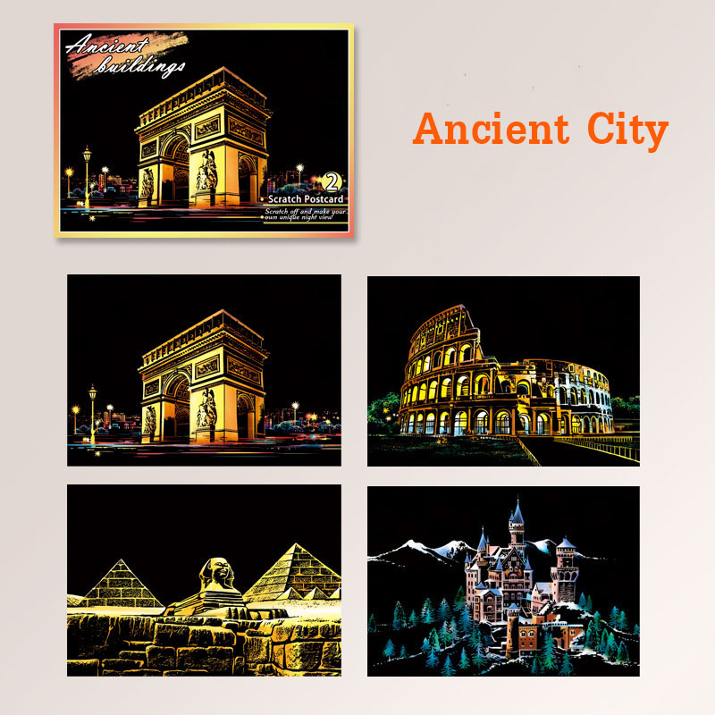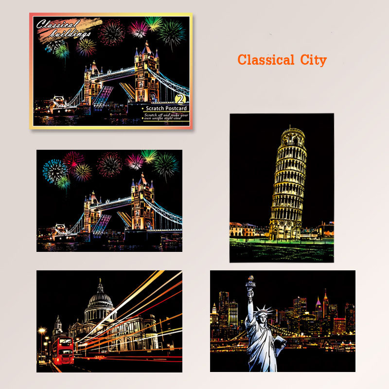 ชุดได้ทั้ง 4 ภาพ) ฟรีแท่งไม้ขูดทุกชุด Magic Scratch Art ขนาด 14×20 cm แผ่นขูดภาพวิวระบายสีต่างประเทศ ช่วงอายุแนะนำ 8 ปีขึ้นไป