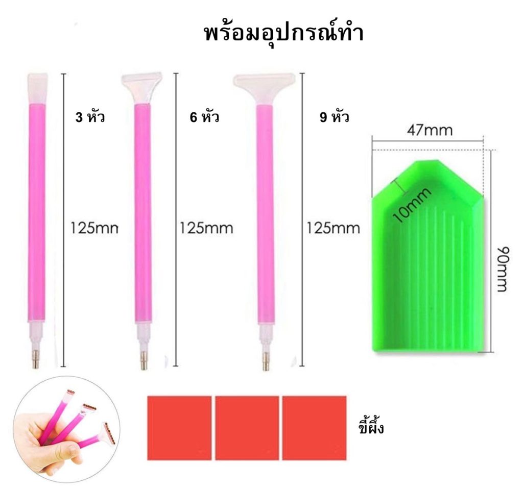 สินค้าพร้อมส่งอุปกรณ์ใน 1 ชุด1. ภาพบนผ้าใบแคนวาส2. เม็ดเพชรสีต่างๆ3. อุปกร์สำหรับติดเพชร 1 ชุดวิธีทำ-เพียงแค่นำปลายปากกากดลงบนแผ่นขี้ผึ้งก่อนจิ้มเม็ดคริสตัล-ลอกพลาสติกเฉพาะส่วนที่ต้องการทำ-นำเม็ดคริสตัลมาวางเรียงบนรูปภาพตามสัญลักษณ์ที่กำหนดไว้-เมื่อติดเสร็จ กดเม็ดคริสตัลกับผ้าให้แน่นยิ่งขึ้นประโยชน์ / Application- งานอดิเรก สนุกสนานไปกับงานศิลปะ- พักผ่อน ฝึกสมาธิ- เสริมพัฒนาการทางด้านอารมณ์และความคิด- ใช้ตกแต่งบ้าน ร้านค้า ร้านกาแฟ- ให้เป็นของขวัญคนพิเศษ