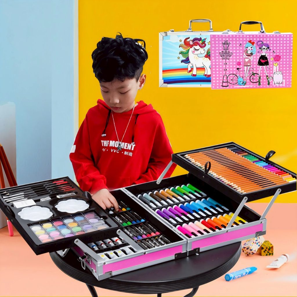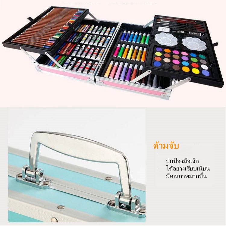 ชุดอุปกรณ์เครื่องเขียนสำหรับเด็ก เสริมสร้างพัฒนาการการเรียนรู้ ความคิดสร้างสรรค์ สีหลากหลายรูปแบบ เพื่อให้น้องๆสนุกกับกิจกรรมการระบายสี หลากหลายสี ทั้งโทนเข้ม โทนอ่อน พาสเทล- สำหรับงานศิลปะ อุปกรณ์ครบครัน- จำนวนทั้งหมด 145 ชิ้น กล่องอลูมิเนียมมีลายน่ารัก เด็กๆได้ไปต้องกรี๊ดแน่นอน มีที่ล็อค มีหูหิ้ว ทนทานไม่แตกง่าย มี 2 ชั้น สวยงาม สีไม้แท่งยาวจับถือง่ายไม่หมดไว สีเทียน สีเมจิก แท่งใหญ่ เหมาะสำหรับเด็กๆ จับถนัดมือ เหมาะสำหรับให้เด็กๆเป็นรางวัล ของขวัญ ช่วยฝึกฝนความสามารถการเรียนรู้ด้านศิลปะทั้งชุดประกอบด้วย – สีไม้แท่งยาว 28 สี – สีเมจิกแท่งใหญ่ 33 สี – สีเทียนแท่งใหญ่ 24 สี – สีน้ำ+อะคลิลิค 24 สี – กบเหลา 1 อัน – จานสี 2 อัน – ยางลบ 2 ชิ้น – พู่กัน 4 อัน – ดินสอ 2 แท่ง – สีฝุ่น 24 สี